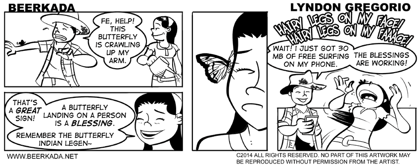 Butterfly – Blessing Oct15 by Lyndon on October 15, 2014 at 12:01 am Chapter: Beerkada Comics └ Tags: blessing, butterfly, fe, jimmy, smartphone, websurfing Comment